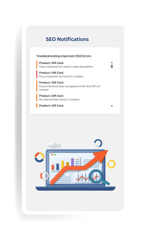 Optimize each product with keyword-focused titles, meta descriptions, content scoring, and SEO health indicators.